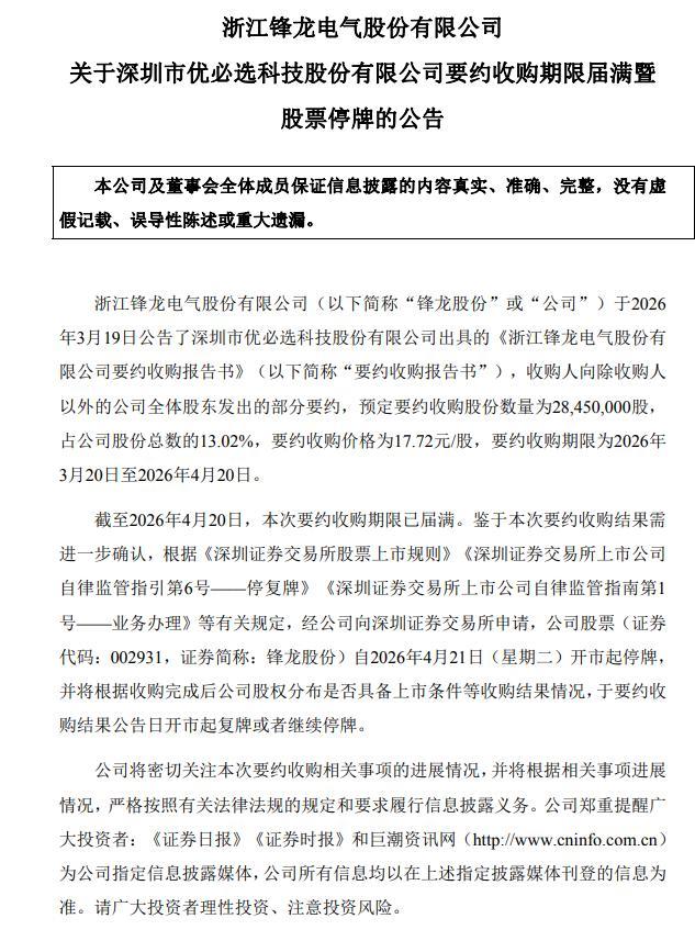 4月20日,锋龙股份(002931.SZ)公告,深圳市优必选科技股份有限公司的要约收购期限已于2026年4月20日届满。本次预定要约收购股份数量为2845万股,占公司股份总数的13.02%,收购价格为17.72元/股,要约收购期限为2026年3月20日至2026年4月20日。由于需进一步确认要约收购结果,公司股票自2026年4月21日开市起停牌。