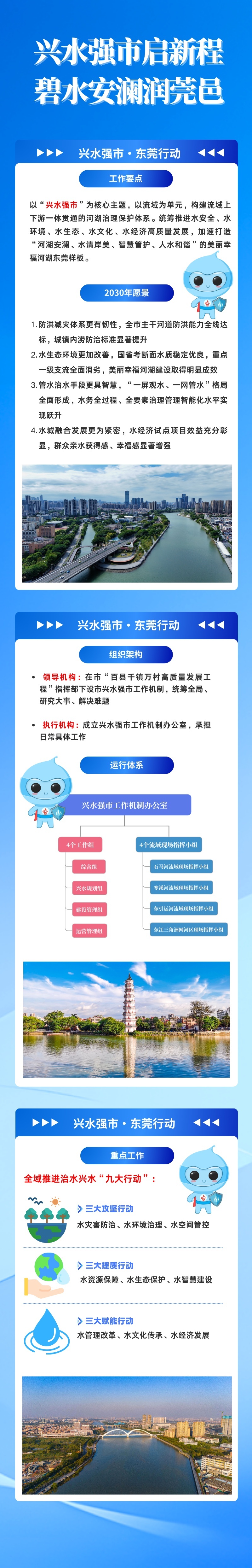 会议重点部署了“兴水强市”工作任务,明确在市“百县千镇万村高质量发展工程”指挥部下设市兴水强市工作机制,全面统筹协调全市兴水强市建设工作,研究重大事项,解决重大问题。同时,成立工作机制办公室承担日常业务。依托该机制,构建起“市级统筹、流域协同、部门联动、镇街落实”的治水闭环工作体系,全域推进治水兴水“九大行动”,全面提升防洪、供水及水生态安全保障水平,打造人水和谐和美宜居现代化新东莞,奋力实现“兴水强市”目标。